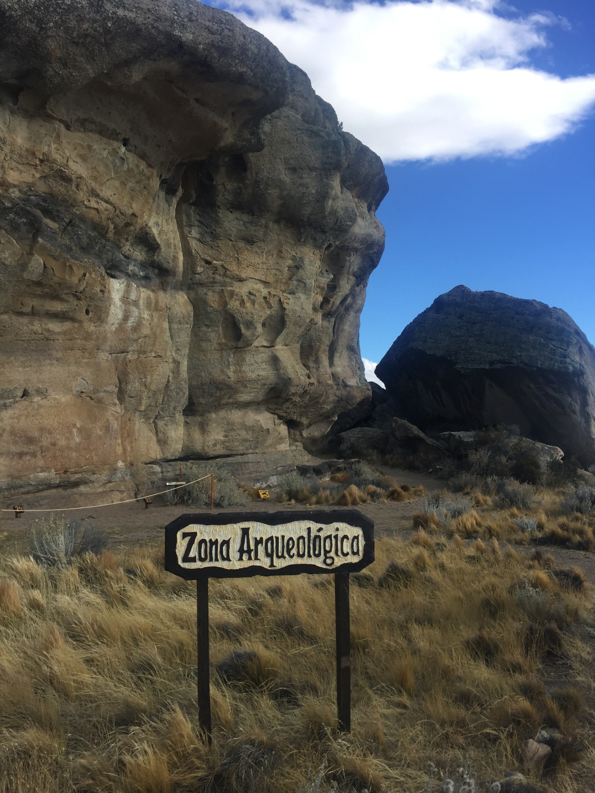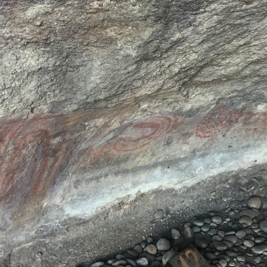 Lá encontramos várias inscrições rupestres originais dentro das cavernas do local. De acordo com a guia, elas foram feitas com sangue de animais como guanacos e riscadas com pedras coloridas da região, vermelhas e amarelas.