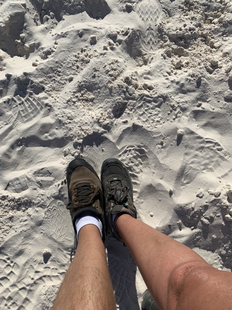 Nós utilizamos sapatos de trilha que são super confortáveis para todos os tipos de solo, mas temos que confessar que entrou muita areia dentro dos sapatos.